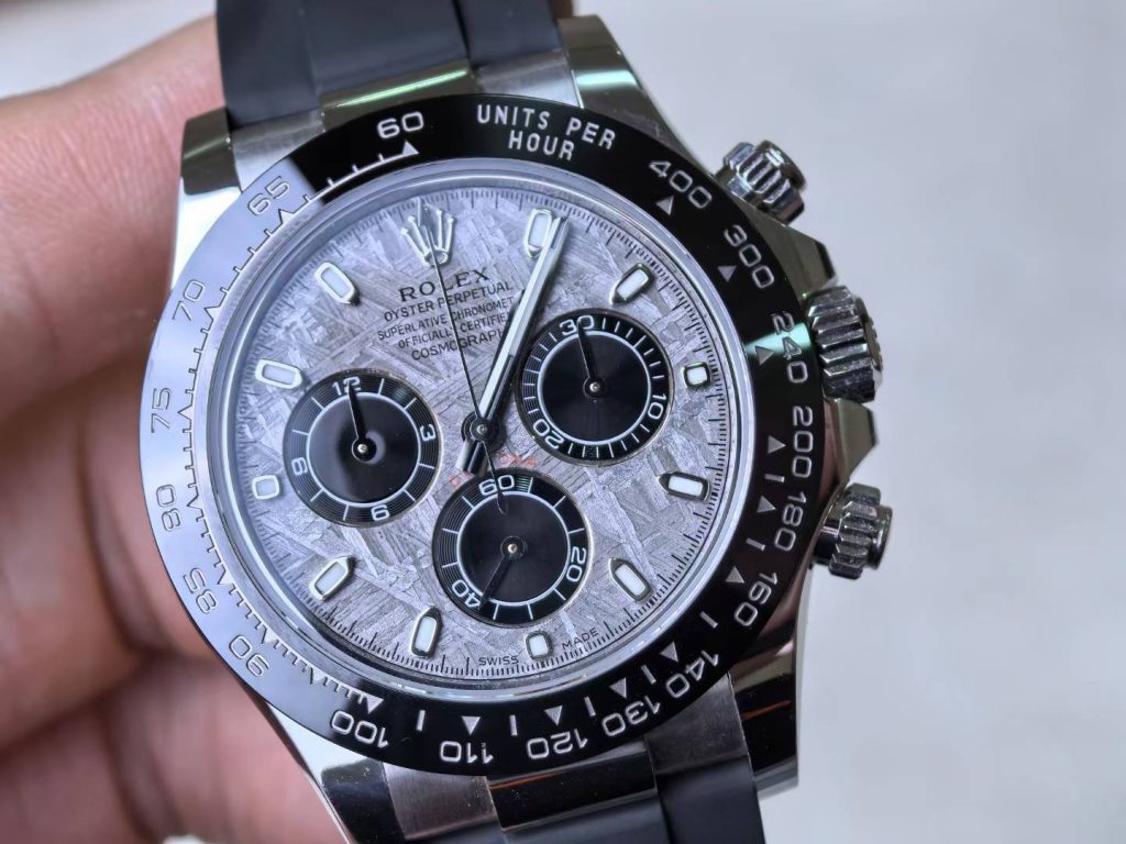 8K gold case custom-molded from genuine factory data, paired with a genuine meteorite dial.