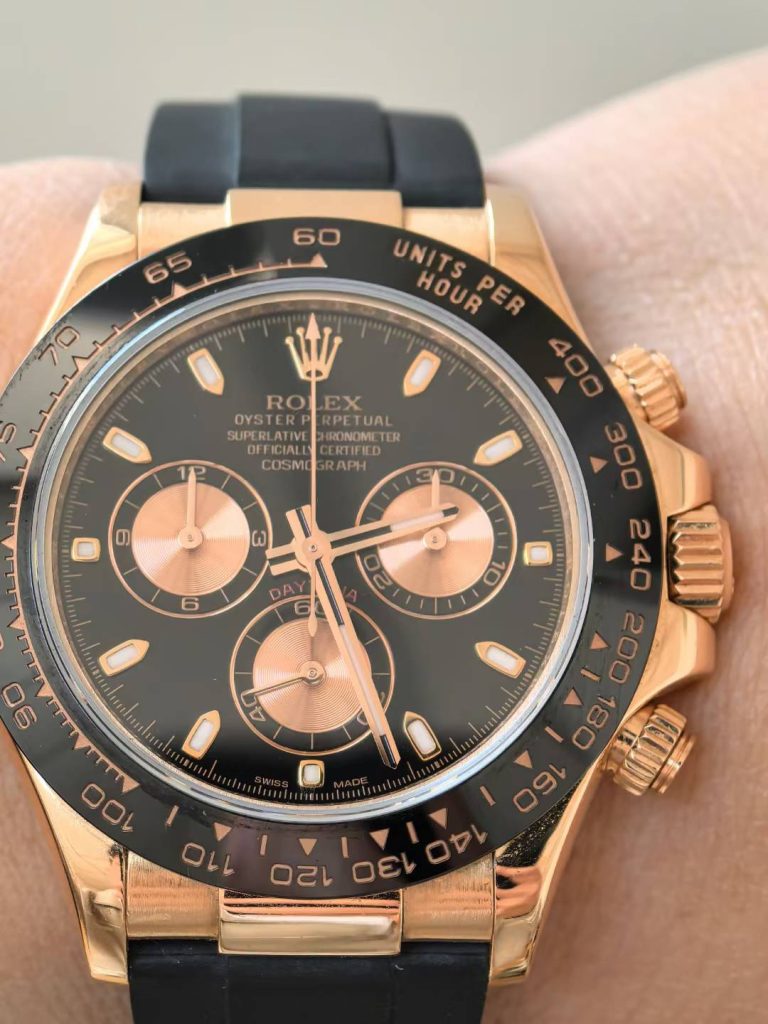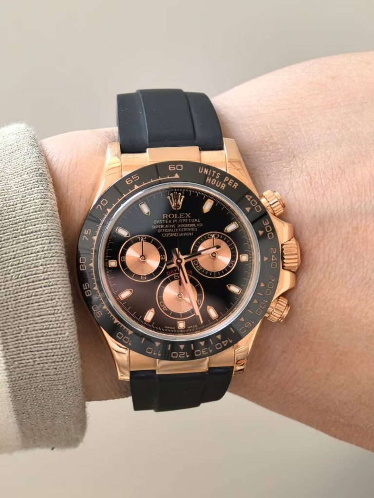 Custom 18K rose gold 116515 “Golden Eyes” Daytona Leave a reply Custom-molded dial, hands, bezel with a 4130 integrated movement. Pre-owned, great price.
