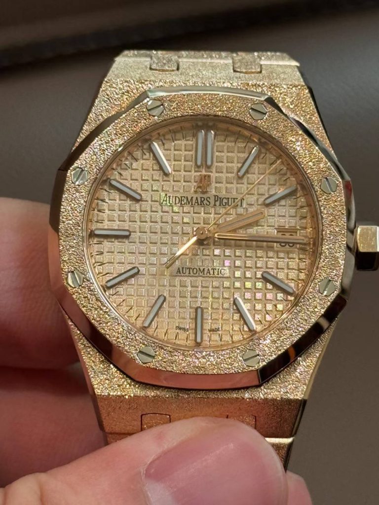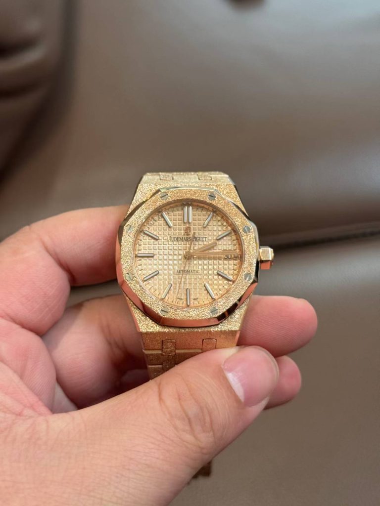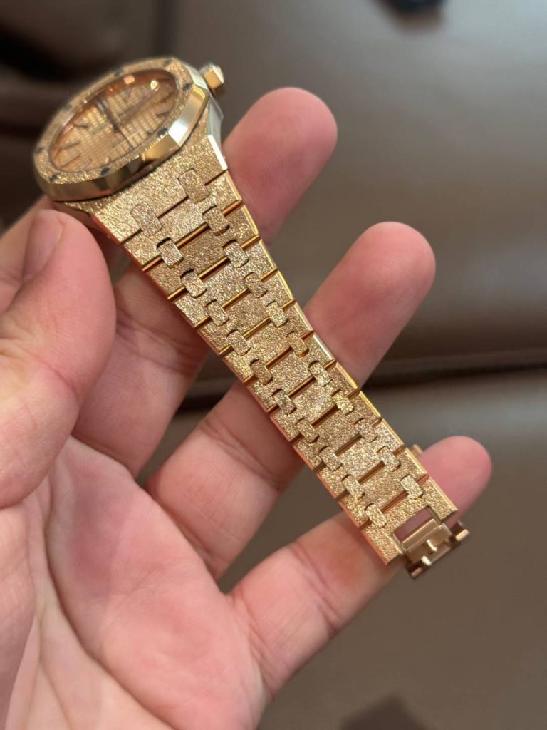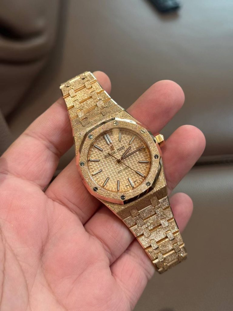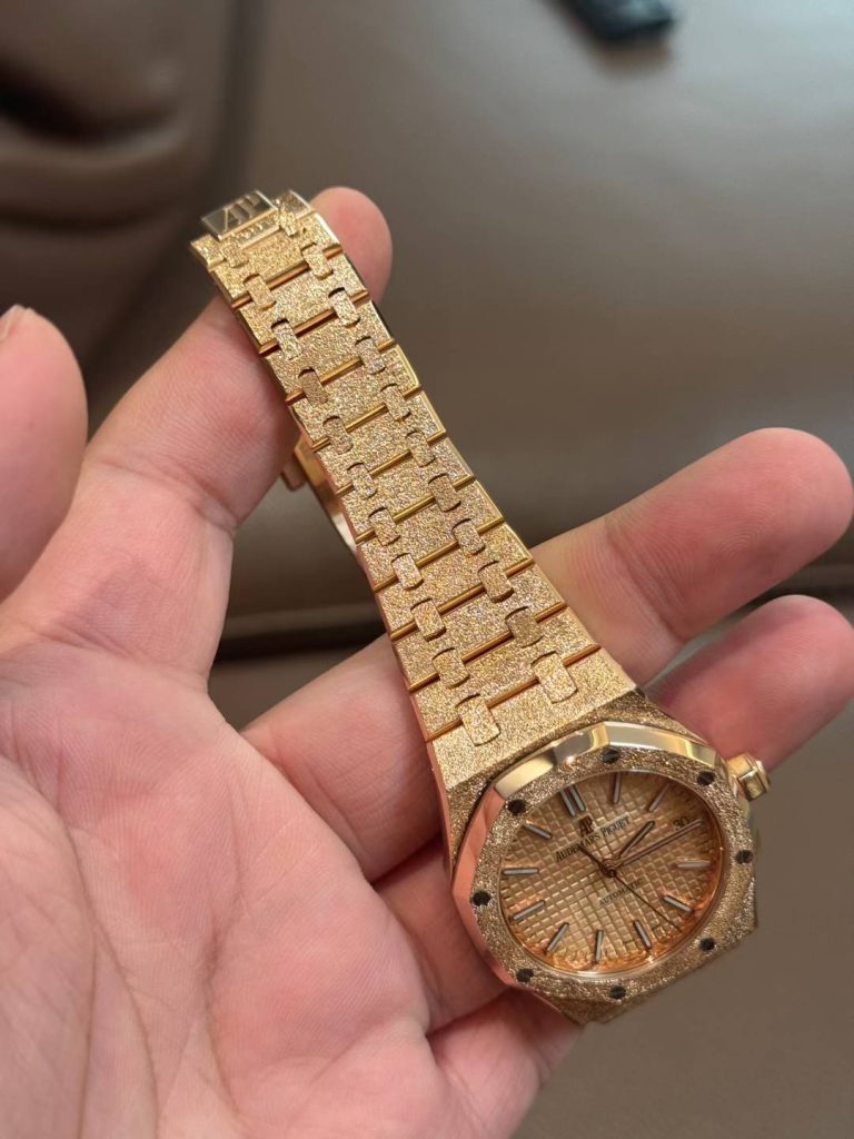 18K solid gold full watch with hand-hammered frosted gold finish. Integrated 3120 movement, custom dial/hands/date wheel. 160g gold weight.