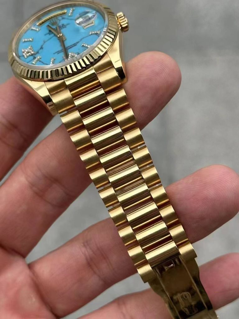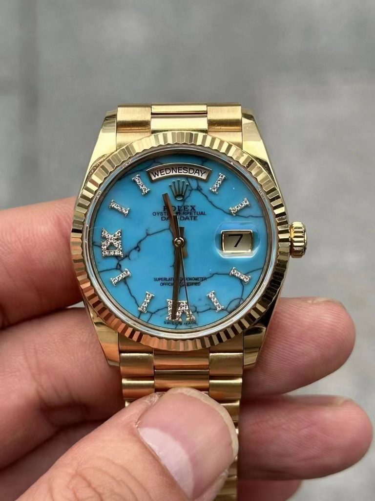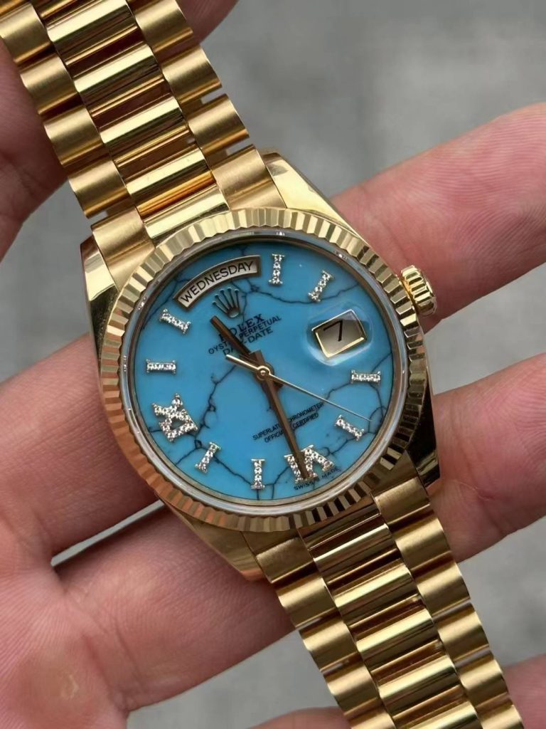 In stock — 128238 turquoise 36mm Day-Date Leave a reply 3D modeled from genuine data, CNC 18K solid gold case and bracelet, paired with a custom genuine turquoise dial.